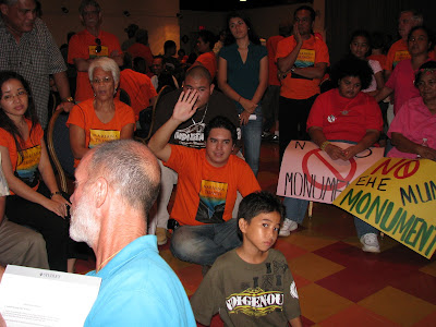 I joined a group that had five of the protestors. They were carrying signs not in support of the monument. After I sat down I was joined by Chailang Palacios, Herman Villagomez, Ed Propst, Daisy Propst, Ayako Matsumoto, Alexie Zotomayor, Emelaine Fejeran, Ike Cabrera and a few of my cousin Cindy's boys. We were joined by Jim Davies and PacificaDave, the longliner "consultant" who has been leaving nasty comments on the blogs (he is in the brown shirt, second from the right, in the first photo above).